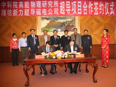 2009年12月10日上午,濰坊新力超導(dǎo)磁電科技有限公司與中科院高能物理研究所超導(dǎo)項(xiàng)目合作簽約儀式在濰坊富華大酒店舉行。出席儀式的有中科院高能所常務(wù)副所長王貽芳,濰坊市市長助理、高新區(qū)黨委書記、管委會主任趙志遠(yuǎn),濰坊新力超導(dǎo)磁電科技有限公司董事長兼總經(jīng)理王兆連,中科院高能所所地合作辦公室主任王殿臣,中科院高能所超導(dǎo)磁體中心主任朱自安,濰坊市高新區(qū)副書記、管委會副主任張龍江,濰坊市高新區(qū)招商局局長房士華,中科院高能所項(xiàng)目管理員謝萬,濰坊新力超導(dǎo)磁電科技有限公司技術(shù)中心總經(jīng)理劉風(fēng)亮,濰坊新力超導(dǎo)磁電科技有限公司技術(shù)辦主任付佩超。