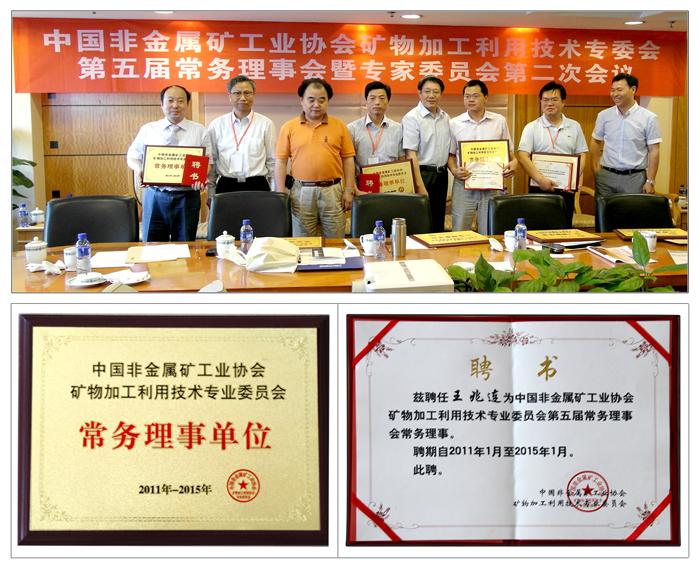 2011年5月15日,中國非金屬礦工業(yè)協(xié)會礦物加工利用技術(shù)專業(yè)委員會第五屆常務(wù)理事會和專家委員會第二次會議在長沙金源大酒店召開。會議批準(zhǔn)聘任我公司董事長兼總經(jīng)理王兆連為中國非金屬礦工業(yè)協(xié)會礦物加工利用技術(shù)專業(yè)委員會第五屆常務(wù)理事會常務(wù)理事,并批準(zhǔn)我公司為常務(wù)理事單位。至此,我公司已分別加入濰坊市循環(huán)經(jīng)濟與新能源發(fā)展促進會、濰坊市工業(yè)技術(shù)研究會、山東省發(fā)明協(xié)會、山東省光彩事業(yè)促進會、中國重型機械工業(yè)協(xié)會、中國重型機械工業(yè)協(xié)會洗選設(shè)備專業(yè)委員會、中國重型機械工業(yè)協(xié)會破碎粉磨設(shè)備專業(yè)委員會、中國重型機械工業(yè)協(xié)會礦山機械分會、中國重型機械工業(yè)協(xié)會帶式輸送機協(xié)會、全國礦山機械標(biāo)準(zhǔn)化技術(shù)委員會等組織,成為其會員、理事、常務(wù)理事、副理事長單位。