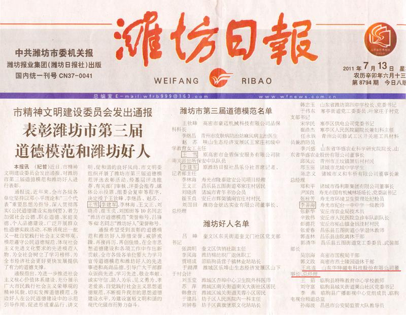近日,濰坊市精神文明建設(shè)委員會(huì)發(fā)出通報(bào),經(jīng)基層評(píng)選推薦、有關(guān)部門審核、評(píng)委推薦、媒體公示投票、組委會(huì)復(fù)審等程序,我公司董事長(zhǎng)兼總經(jīng)理王兆連等62名同志以在重品行、講文明、促和諧等公民道德建設(shè)中的引導(dǎo)示范作用,被授予“濰坊好人” 榮譽(yù)稱號(hào)。