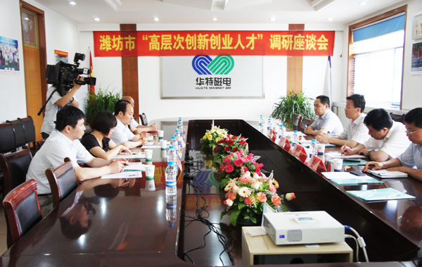 6月6日下午,濰坊市高層次創新創業人才調研座談會在華特公司舉行。縣常委、組織部長周書坤出席座談會并代表縣委、縣政府向華特磁電外聘專家、中國科學院電工研究所研究員彭愛武發放了專項扶持金100萬元。臨朐縣財政局局長譚茂村、臨朐縣委組織部副部長韓其剛、城關街道黨工委書記沈明新,公司董事長兼總裁王兆連、公司常務副總劉風亮出席了座談會。