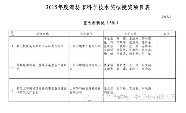 2015年度濰坊市科學技術獎評審工作已經結束,根據《濰坊市科學技術獎勵辦法》規定,建議授獎的人選和項目:市重大科技創新獎3項,市國際合作獎3項,市自然科學獎技術發明獎、科技進步獎共150項。我公司研制開發的“新型立環高梯度磁選裝備關鍵技術研發及產業化”項目是濰坊市重大科技創新大獎的其中之一,這標志著我公司科技創新產品研發工作已步入了一個新的高度,科技成果是企業科技與經濟相結合的重要途徑,是提高科技創新能力,推動創新驅動發展的重要手段,加速科技成果轉化,實現經濟社會效益有力保障。該項工作的開展將更加有力的推進科技創新進程,進一步增強創新能力建設信心。根據市獎勵辦法,獲此獎項將獲得10萬元科技獎勵獎金。