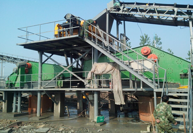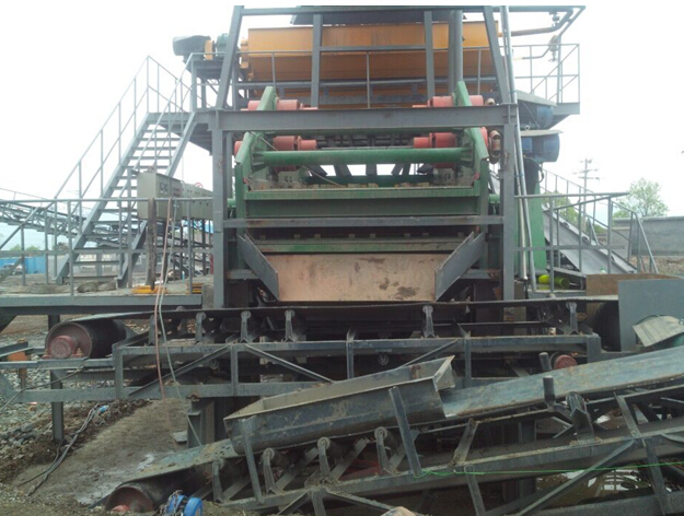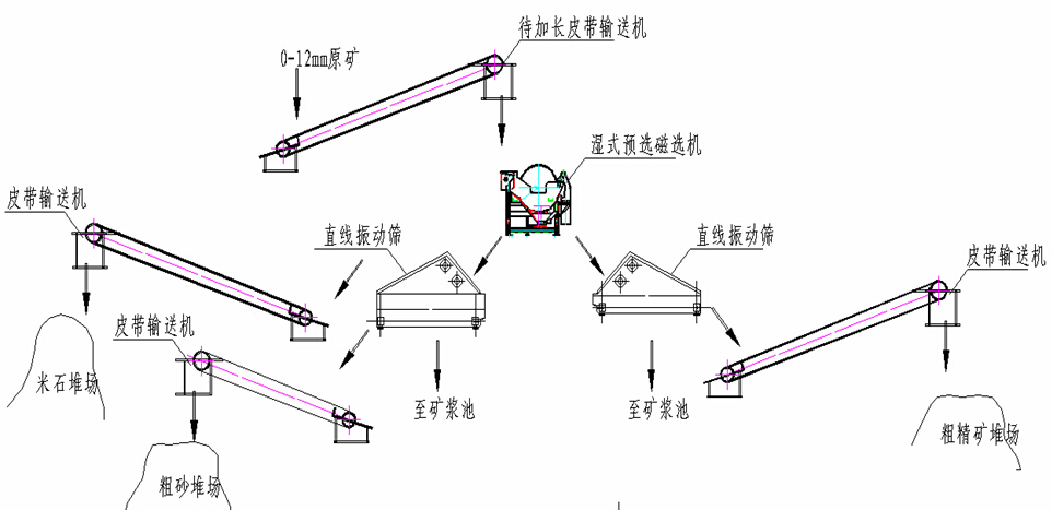 主要工藝流程:廢石經細破至-12mm,首先經過濕式預選磁選機分選出粗精礦和尾礦;粗精礦進入振動篩分級,分別篩出大顆粒粗精礦和細顆粒粗精礦;尾礦進入振動篩分級,分別篩出米石、粗砂和細顆粒尾礦。共生產出5種產品。