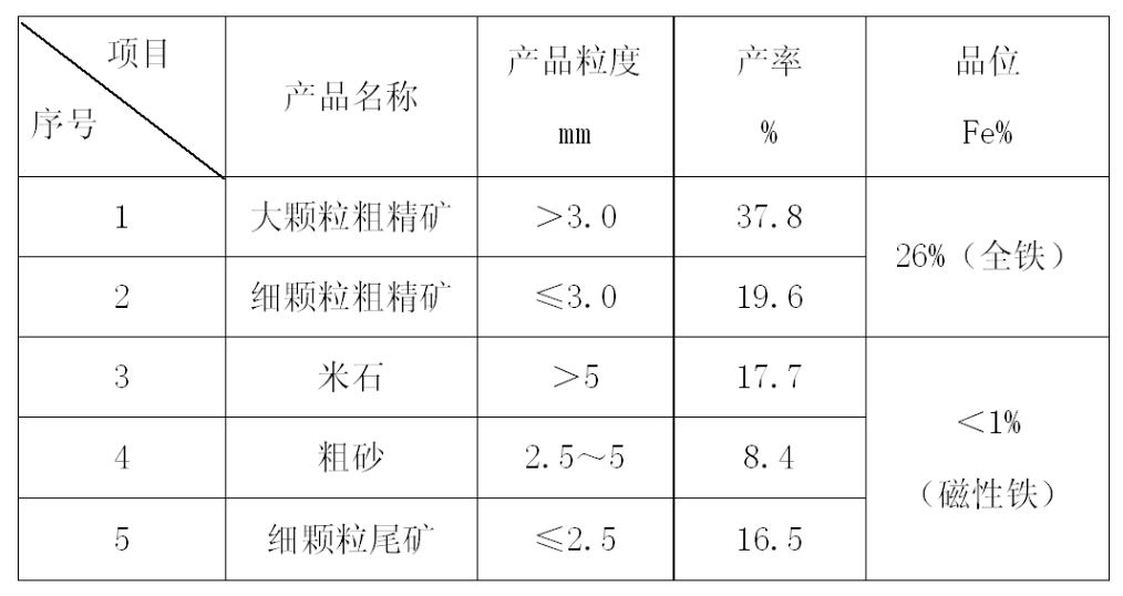 廢石原礦全鐵品位18%,經過濕式預選后,精礦全鐵品位26%,較原礦品位提高8%;尾礦(建筑用產品)磁性鐵平均品位小于1%。